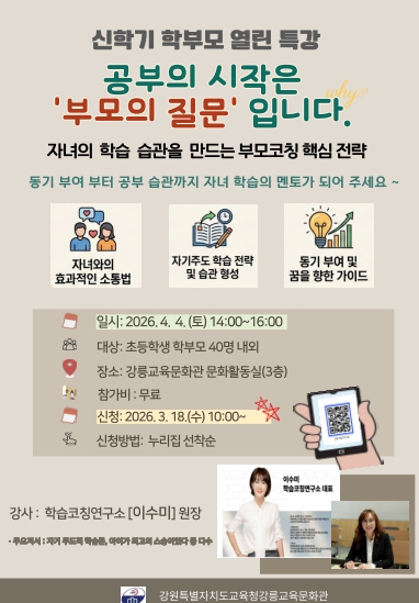 [뉴스앤톡] 강릉교육문화관은 오는 4월 4일 오후 2시 초등학교 학부모를 대상으로 ‘학부모 열린 특강’을 운영한다.