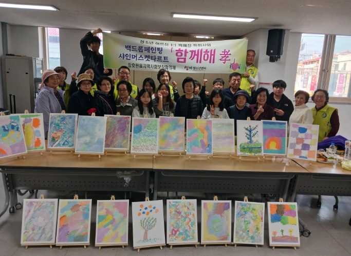 ‘함께해효(孝)’는 지역사회 내 청소년과 어르신을 1:1 짝으로 연결하여 총 20명이 첫째 날 백드롭페인팅, 둘째 날 샤인머스킷타르트 만들기를 서로 도와가며 체험함으로써 세대 간 소통과 이해를 증진하고자 하는 장호원읍협의체 특화사업이다. 이 사업은 청미청소년센터, 청미노인복지관과 협업하여 이루어졌다.
