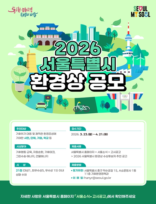 '2026년 서울특별시 환경상'은 기후행동·교육, 자원순환, 기후테크, 그린수송·에너지, 건물에너지 총 5개 분야에서 대상 1명, 최우수상 5명, 우수상 15명 등 총 21명(시민, 단체, 기업)을 선정해 시상할 계획이다.