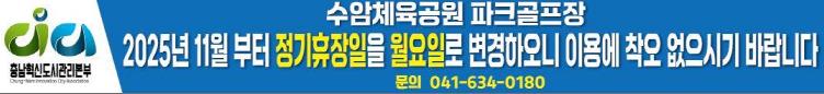 [뉴스앤톡] 지방자치단체조합 충남혁신도시관리본부는 충남 예산군 삽교읍 목리에 조성된 수암공원 파크골프장의 정기 휴장일을 2025년 11월 부터 수요일에서 월요일로 변경하여 운영한다고 밝혔다.