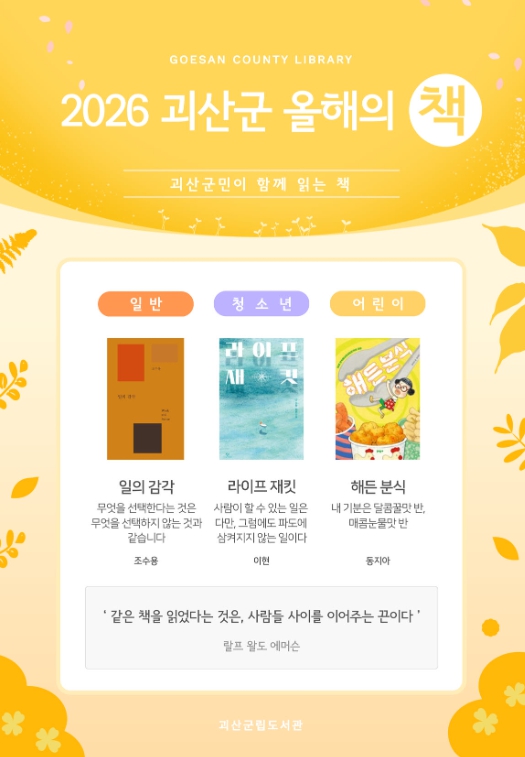 [뉴스앤톡] 충북 괴산군립도서관이 2026년 괴산군 올해의 책으로 일반, 청소년, 아동 분야 각 1권씩 총 3권을 최종 선정했다고 20일 밝혔다.