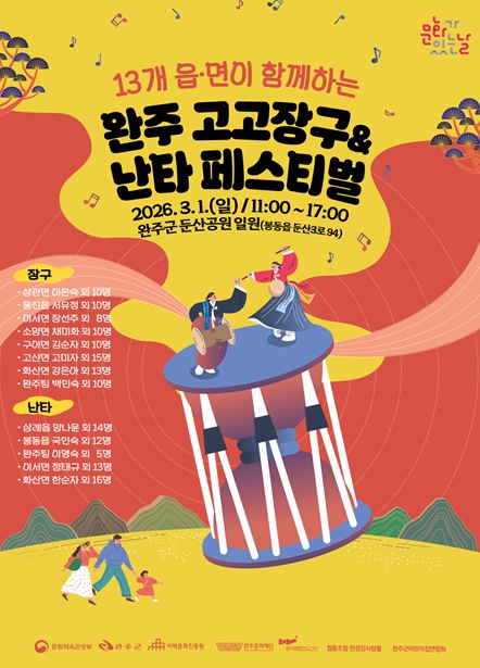 [뉴스앤톡] 완주문화재단은 오는 3월 1일 완주군 둔산공원 일원에서 13개 읍·면이 2026 완주 고고장구·난타 페스티벌을 개최한다.