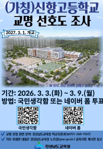 [뉴스앤톡] 경상남도교육청은 2027년 3월 문을 여는 신설 학교 3곳의 이름을 정하기 위해 오는 3일부터 9일까지 도민 선호도 조사를 진행한다.
