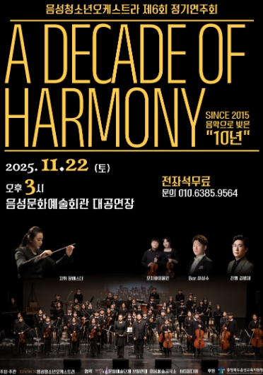 [뉴스앤톡] 충청북도음성교육지원청의 방과후학교 민간공모사업 운영 단체인 음성청소년오케스트라(지휘 장에스더)가 창단 10주년을 맞이하여 오는 11월 22일 오후 3시, 음성문화예술회관 대공연장에서 제6회 정기연주회 ‘A DECADE OF HARMONY’를 개최한다.