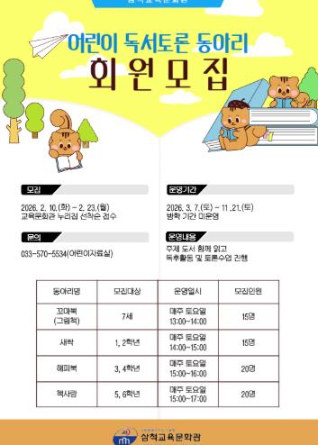 어린이 독서토론 동아리는 꼬마북(7세, 그림책), 새싹(1·2학년), 해피북(3·4학년), 책사랑(5·6학년) 총 4개 동아리로 구성해 매주 토요일 운영하며, 회원모집은 2월 10일부터 2월 23일까지 삼척교육문화관 누리집에서 선착순 접수로 진행된다.