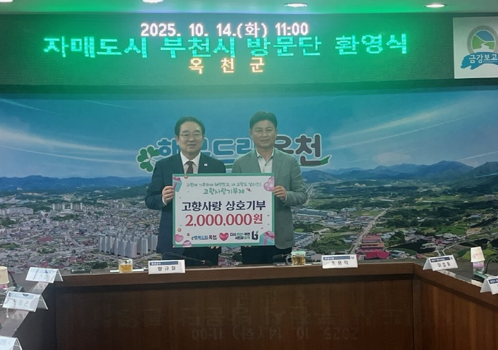 [뉴스앤톡] 14일, 조용익 부천시장을 비롯한 부천시 충청권 정책현장 벤치마킹 방문단 24명이 ‘향수의 고장’ 옥천군을 방문했다. 이번 만남은 2002년 자매결연을 체결한 두 지역 간의 우호 증진과 교류 확대를 위한 자리로 마련됐다. 이날 옥천군과 부천시는 각 200만 원의 고향사랑기부금을 상호 기탁하며 두 지역의 발전을 함께 응원했다.