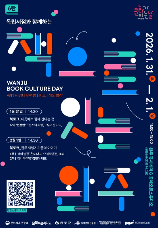 [뉴스앤톡] 완주문화재단은 오는 1월 31일부터 2월 1일까지 이틀간 완주 휴시네마와 공예오픈스튜디오에서 '문화가 있는 날 6탄 – 책으로 잇는 완주'를 개최한다.