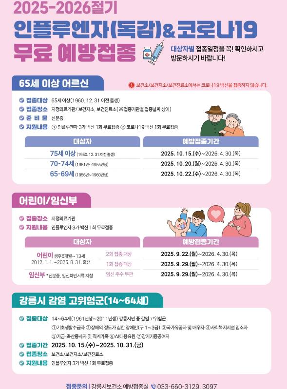 [뉴스앤톡] 강릉시는 겨울철 호흡기 감염병 예방을 위해 오는 9월 22일부터 2025-2026절기 독감 및 코로나19 무료 예방접종을 실시한다고 밝혔다.