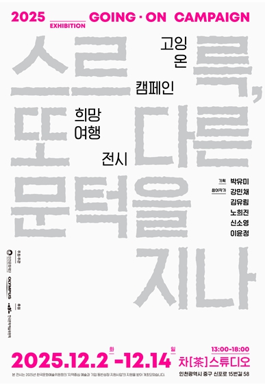 [뉴스앤톡] (재)인천문화재단은 암 경험자와 지역 예술가가 함께한 전시 '2025 고잉 온 캠페인 희망여행' ‘스르륵, 또다른 문턱을 지나’를 오는 12월 2일부터 14일까지 인천 중구 차(茶)스튜디오(인천 중구 신포로15번길 58)에서 운영한다고 밝혔다.