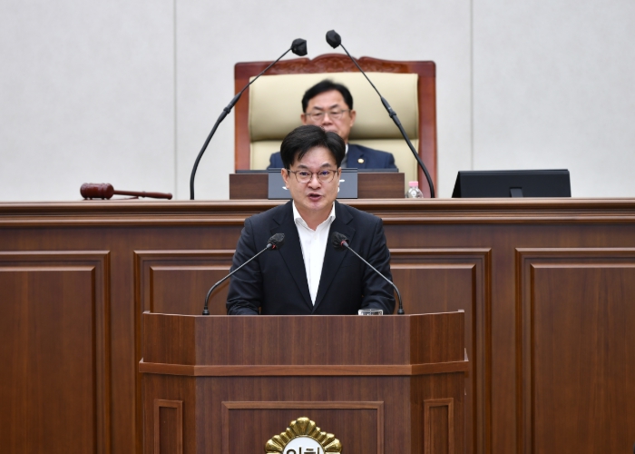 | ▲ 김병수 시장이 1일 김포시의회 제264회 임시회에서 2026년도 시정 및 운용 방향에 대한 시정연설을 하고 있다. |