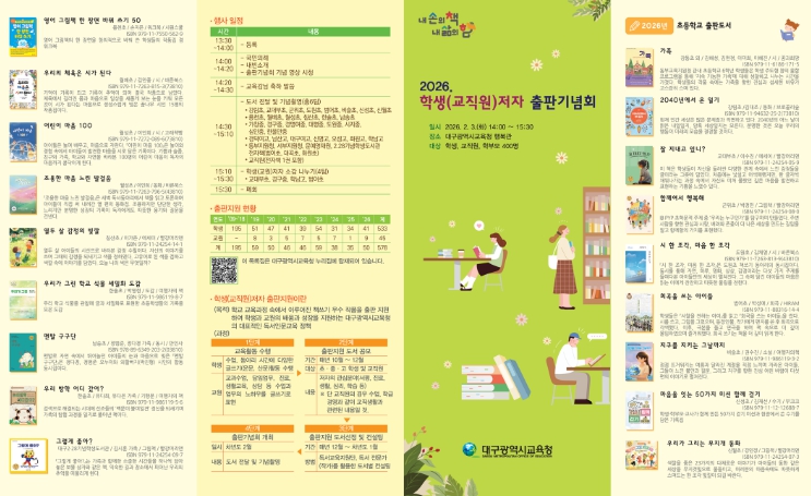 창의융합교육원의 문예영재반 학생들의 작품집, 교육지원청 단위의 학생 글쓰기 프로그램 운영 결과물, 공공도서관에서 시행한 가족 그림책 창작 프로그램에서 탄생한 작품들, 대구미래교육연구원의 전자책 출판 지원 사업까지 다양한 대구교육의 장에서 집필된 우수한 저작물들이 세상 사람들에게 소개되어 출판기념회의 의미를 더욱 뜻깊게 한다.