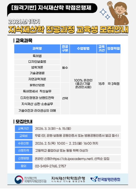 [뉴스앤톡] 지식재산처 국제지식재산연수원은 한국발명진흥회와 공동으로 2월 5일부터 23일까지 지식재산학 학점은행 과정에 대한 온라인 수강생을 모집한다.