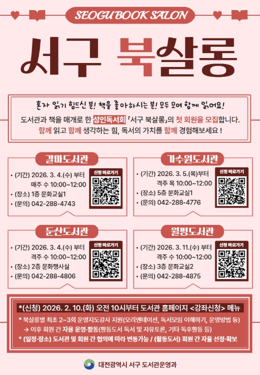 [뉴스앤톡] 대전 서구 4개 공공도서관(갈마, 가수원, 둔산, 월평)은 주민들을 대상으로 책과 도서관을 매개로 한 성인 독서회 ‘서구 북살롱’을 운영한다고 5일 전했다.