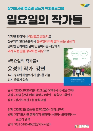 [뉴스앤톡] 김포시 장기도서관은 청소년 글쓰기 특화프로그램으로 '일요일의 작가들'을 오는 10월 26일, 11월 2일 오후 3시부터 5시까지 장기도서관 1층 문화교실에서 운영한다고 밝혔다