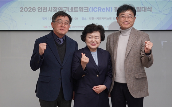 | ▲ 조대흥 인천시사회서비스원장과 김정민 인천여성가족재단 대표이사, 이윤호 인천인재평생교육진흥원장이 지난 6일 2026 인천시정연구네트워크 협업연구 발대식을 열고 기념촬영을 하고 있다. |