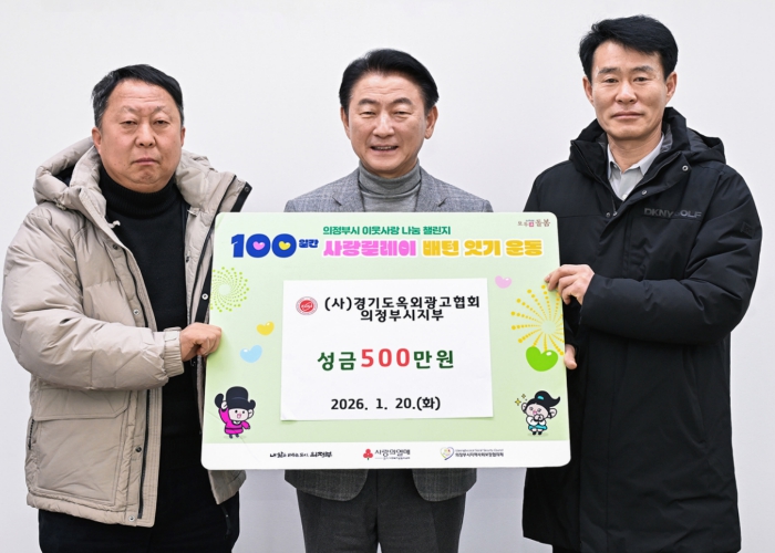 [뉴스앤톡] 의정부시는 1월 20일 (사)경기도옥외광고협회 의정부시지부가 ‘100일간 사랑릴레이 배턴 잇기’에 동참해 성금 500만 원을 기탁했다고 밝혔다.