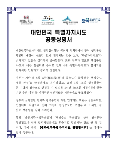세종특별자치시와 제주특별자치도, 강원·전북특별자치도로 구성된 ‘대한민국특별자치시도 행정협의회’는 22일 이같은 내용을 담은 4개 시도지사 명의의 공동성명서를 발표했다.
