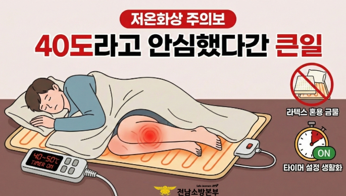 이에 전남소방본부는 안전한 겨울밤을 위한 3대 수칙으로 ▲피부 직접 접촉 피하기(얇은 이불·패드 사용) ▲취침 시 타이머 설정 생활화 ▲라텍스 침구 혼용 금지 등을 제시했다.