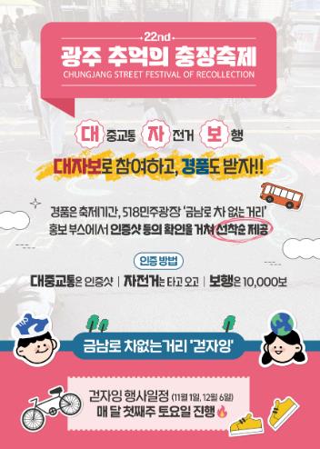 [뉴스앤톡] 광주 동구는 오는 15일부터 5일간 금남로와 충장로 일원에서 열리는 제22회 광주 추억의 충장축제에서 ‘금남로 차 없는 거리’의 가치를 알리고 대자보 도시 정책에 시민 참여를 확대하기 위한 특별 홍보 이벤트를 진행한다고 밝혔다.