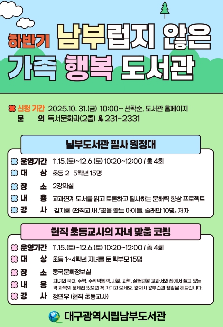 [뉴스앤톡] 대구남부도서관은 11월 15일부터 12월 6일까지 매주 토요일, 부모와 자녀가 함께 도서관을 찾아 각자 맞춤형 독서·학습 프로그램에 참여하는 ‘남부럽지 않은 가족 행복 도서관’을 운영한다.