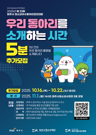 [뉴스앤톡] (재)파주시청소년재단 파주시청소년수련관은 오는 10월 16일부터 10월 22일까지 “제23회 파주시 청소년우수동아리경진대회”의 참가 동아리를 모집한다.