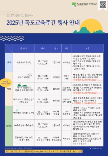 [뉴스앤톡] 경상북도교육청 청도도서관은 오는 10월 17일부터 30일까지 지역 주민을 대상으로 '2025년 독도교육주간 행사'를 운영한다.