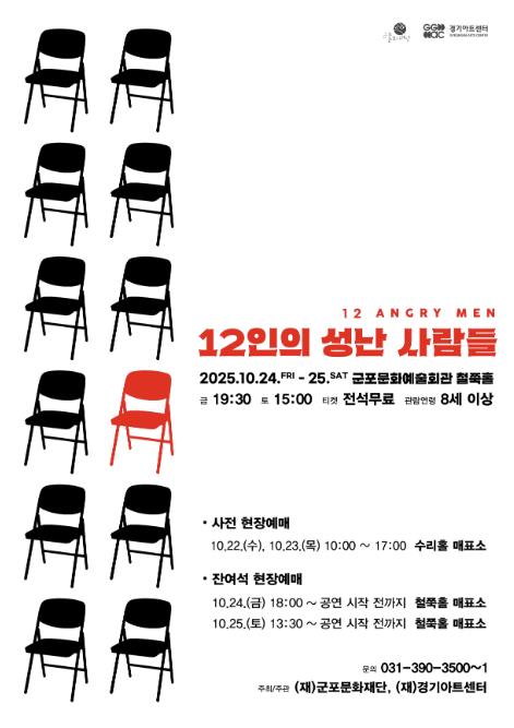 연극 “12인의 성난 사람들”은 리즈날드 로즈의 동명 소설을 각색한 작품으로 친부 살인 혐의를 받은 16세 소년의 유무죄를 두고 배심원 12명이 치열한 토론을 펼치는 내용으로 집단 속 개인의 신념과 도덕적 책임을 물으며, 편견과 왜곡의 잔인성을 고발하며 인간 생명의 존엄을 일깨우는 작품이다. 장용휘가 연출을 맡았으며 각색 유현서, '2025 경기 청년예술 기회무대 재공연 사업'으로 선발된 12명의 청년 배우들이 각 배역을 맡아 열연을 펼칠 예정이다.