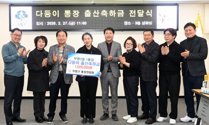 [뉴스앤톡] 부평구는 27일 통장연합회가 최근 넷째 아이를 출산한 이문정 부평2동 1통장에게 축하금 100만 원을 전달했다고 밝혔다.