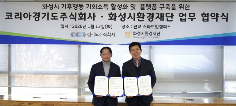 [뉴스앤톡] 경기도주식회사는 13일 경기도 성남시 판교 스타트업캠퍼스에서 화성시환경재단과 ‘기후행동 기회소득 활성화 및 화성시 플랫폼 구축을 위한 업무협약’을 체결했다.