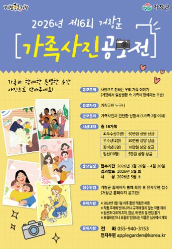 2021년 처음 시작된 이후 올해로 6회째를 맞은 이번 공모전은 ‘사진으로 전하는 우리 가족 이야기’를 주제로, 거창군민이라면 누구나 참여할 수 있다.