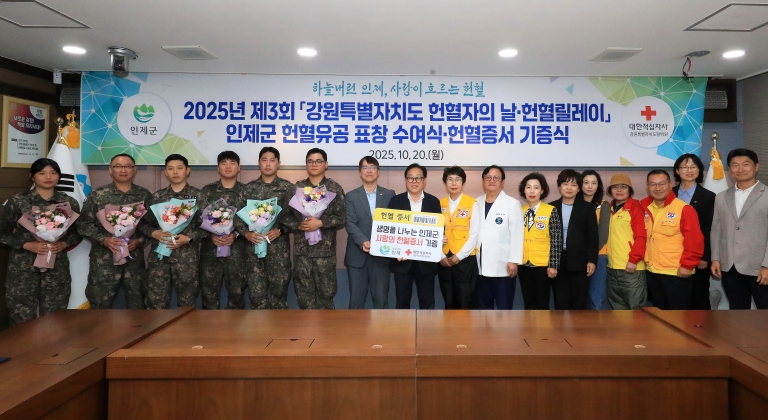 [뉴스앤톡] 인제군은 ‘2025 헌혈자의 날’을 기념해 지난 10월 20일 인제군청 소회의실에서 헌혈유공자 12명에게 인제군수 표창을 수여하고, 헌혈증서 1,000매를 강원혈액원에 기부했다고 밝혔다.