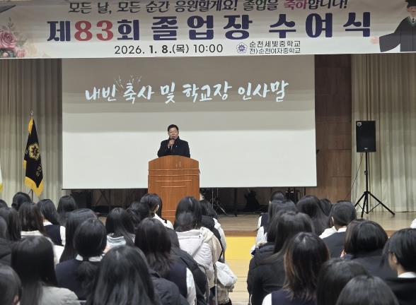 [뉴스앤톡] 김정희 전남도의회 교육위원장은 1월 8일, 순천세빛중학교에서 열린 제83회 졸업식에 참석해 졸업생들의 새로운 출발을 축하하고, 전남교육의 미래를 향한 따뜻한 격려의 메시지를 전했다.