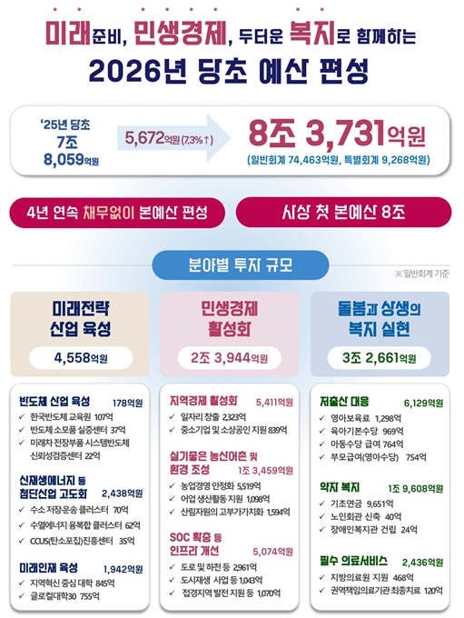 본예산은 특별회계 포함 처음으로 8조 원을 넘었으며, 이는 지방세와 보통교부세의 증가뿐만 아니라 국비 확보 노력의 결과로,① 미래전략산업 육성 ② 민생경제 회복 ③ 돌봄과 상생의 복지 실현, 3대 분야에 집중 투입된다.