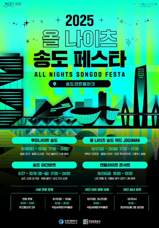 [뉴스앤톡] 인천광역시와 인천관광공사는 오는 10월 17일부터 26일까지 송도센트럴파크 일대에서 '2025 올 나이츠 송도 페스타'를 개최한다고 밝혔다.