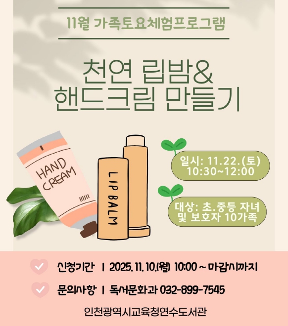 이번 프로그램은 초·중등 자녀와 부모가 함께 참여할 수 있는 강좌로, 식물성 오일과 자연 친화적 재료를 활용해 직접 천연 립밤과 핸드크림을 만드는 체험을 진행한다.