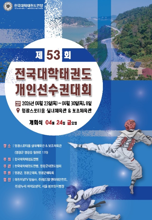 [뉴스앤톡] 영광군이 오는 23일부터 30일까지 8일간 제53회 전국대학태권도 개인선수권대회를 영광스포티움 국민체육센터 및 실내보조체육관에서 개최한다고 밝혔다.