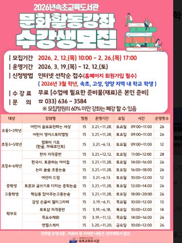 | ▲ 속초교육도서관, 2026년 문화활동강좌 수강생 모집 |