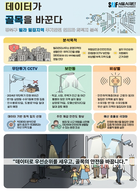 이번 분석보고서 '빌라 밀집지역 주거안전 인프라 최적지 분석: 강북구 편'은 12월 10일부터 서울AI재단 누리집 ‘연구보고서’ 메뉴에서 확인할 수 있다.