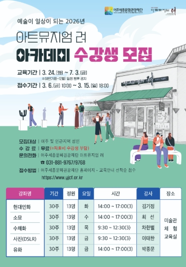 [뉴스앤톡] 여주세종문화관광재단 아트뮤지엄 려에서 2026년 3월 6일 ~ 3월 15일 동안 아트뮤지엄 려 아카데미 강좌 수강생을 모집한다고 밝혔다.