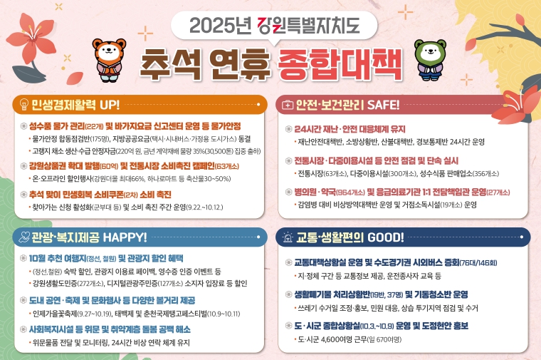 이번 대책은 △민생경제 활력, △안전·보건 강화, △관광·복지 제공, △교통·생활 편의 4개 분야 19개 과제로 마련됐으며, 연휴 기간 도와 시군은 4,600여 명이 참여하는 종합상황실을 운영해 긴급 상황에 신속히 대응한다.
