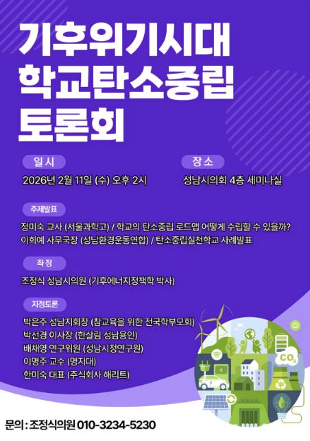 [뉴스앤톡] 기후위기 대응과 학교 현장의 탄소중립 실천 방안을 논의하기 위한 '기후위기 시대 학교 탄소중립 토론회'가 오는 2026년 2월 11일 오후 2시, 성남시의회 4층 세미나실에서 열린다.