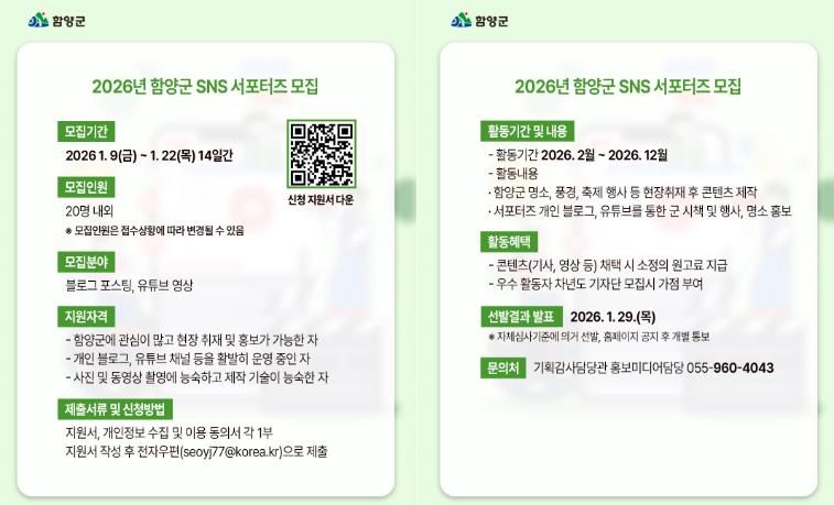 [뉴스앤톡] 함양군은 군민의 눈높이에서 소통하며 군의 생생한 현장 소식을 전달할 ‘2026년 함양군 누리소통망(SNS) 서포터즈’를 모집한다고 밝혔다.