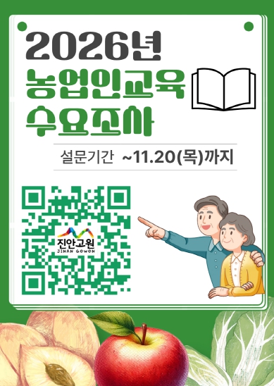 [뉴스앤톡] 진안군(군수 전춘성)은 2026년도 진안환경농업대학 및 농업인교육 과정 선정을 위해 10월 21일부터 11월 20일까지 한 달간 진안군민과 농업인의 다양한 의견을 반영하기 위한 ‘농업인 교육 수요조사’를 실시한다.