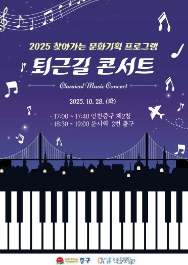 [뉴스앤톡] (재)인천중구문화재단(이사장 김정헌)은 오는 28일 저녁 퇴근길 시민들을 위한 특별한 문화 행사 ‘2025 영종 퇴근길 콘서트’를 개최한다.