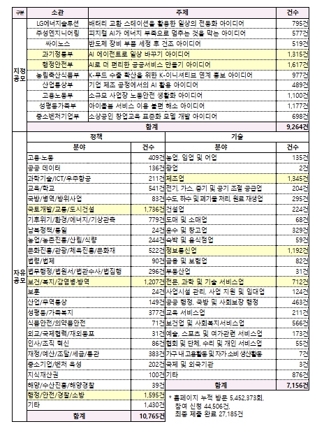 분야별로 살펴보면, 자유공모 정책분야에 가장 많은 10,765건(39.6%)이 접수됐으며, 지정공모 9,264건(34.1%), 자유공모 기술분야 7,156건(26.3%) 순으로 집계됐다.