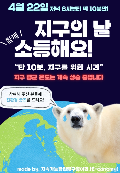 참여자들은 이날 오후 8시부터 10분간 각자의 가정과 기숙사에서 실내 전등을 끄고 소등행사에 동참하며, 일상 속 에너지 절약 실천이 환경에 미치는 영향을 생각해 보고 이를 친환경 창업 아이디어와 연결하는 시간을 가진다.