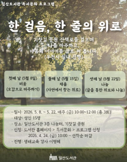 일산도서관 관계자는 “‘한 걸음, 한 줄의 위로’는 자연 속에서 천천히 걷고 글로 자신을 표현하는 과정을 통해 스스로를 돌보고 치유하는 프로그램”이라며, “참여자들이 서로의 이야기를 나누며 공감과 위로를 경험하는 시간이 되길 바란다”고 전했다.