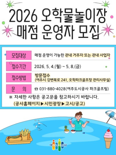 [뉴스앤톡] 여주도시공사는 2026년 오학물놀이장 운영을 앞두고 이용객 편의 제공을 위한 매점 운영자를 공개 모집한다고 밝혔다.