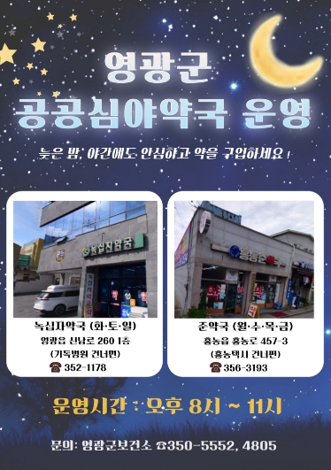 [뉴스앤톡] 영광군은 오는 2월 9일부터 공공심야약국 2개소를 지정하여 매일 오후 8시부터 11시까지 운영한다고 밝혔다.