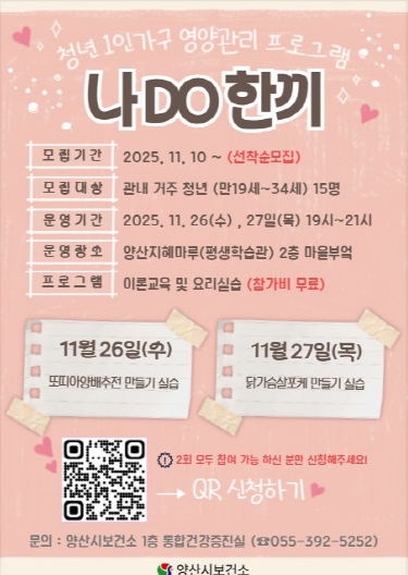 [뉴스앤톡] 양산시보건소는 청년 1인 가구의 건강한 식습관 형성 및 자가 영양 관리 능력 향상을 위한 영양 관리 프로그램 ‘나DO한끼’를 11월 26일과 27일 양일간 운영한다고 밝혔다.